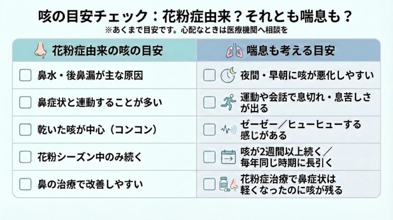 以下のような特徴がある場合は、「花粉症の咳」だけでなく、気道の過敏性が関わっていないかも含めて相談の目安になります。