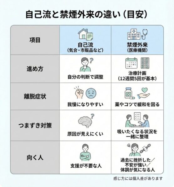 禁煙は「意志が弱いからできない」というより、依存と習慣の影響が重なることで難しくなることがあります。禁煙外来では、薬や面談支援を組み合わせることで、自己流より継続しやすくなることが期待されます(感じ方には個人差があります)。