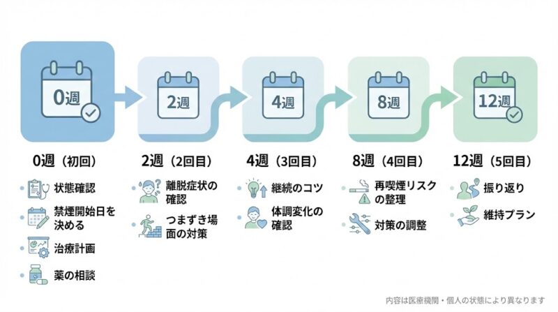 禁煙治療は「続ける設計」になっています。毎回、体調やつまずきポイントを確認し、対策を積み上げていきます。